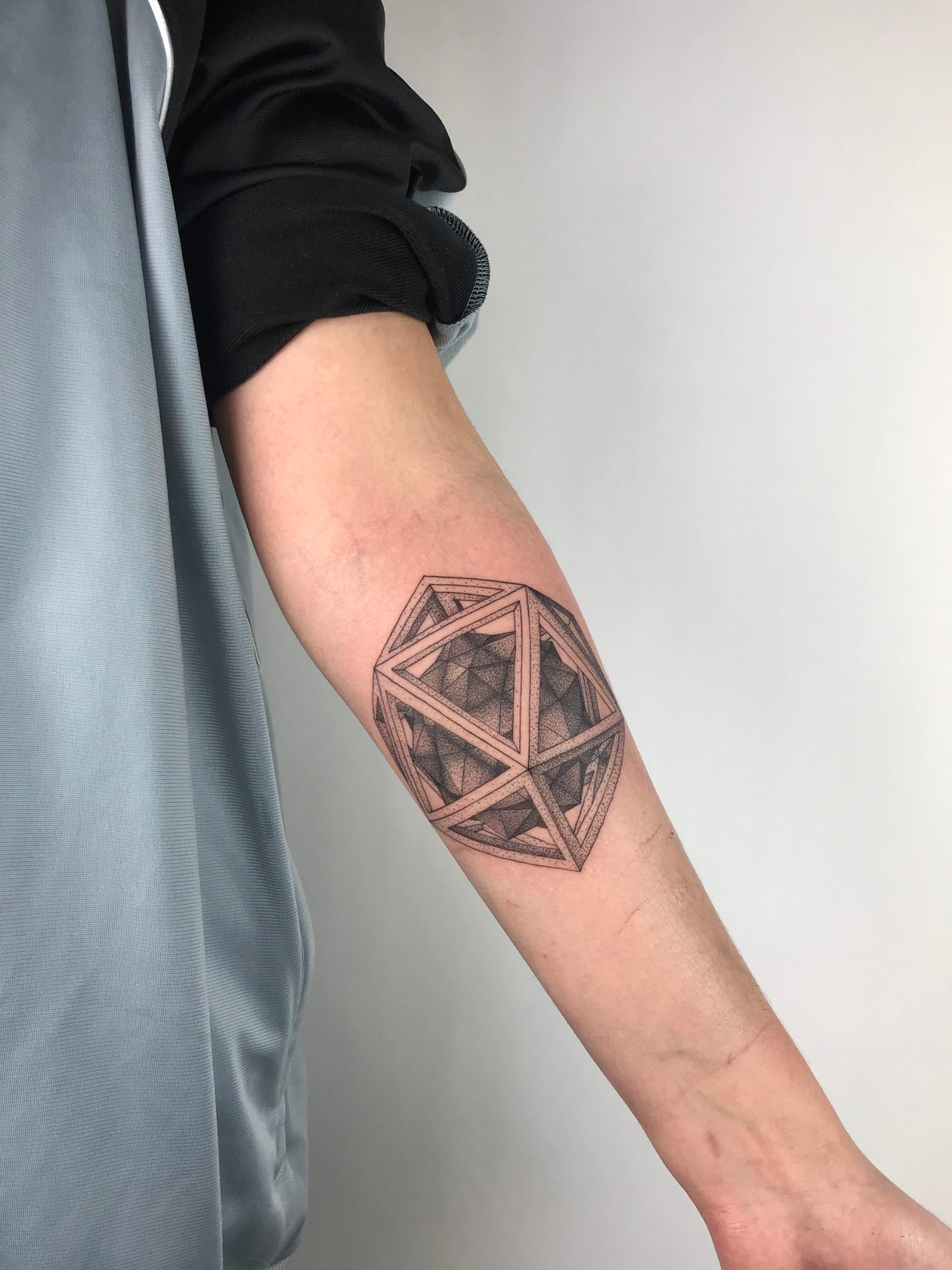 Геометрия - один из уникальных и оригинальных стилей художественной татуировки, который появился не так давно, но довольно быстро прогрессирует. Некоторые люди не понимают татуировок выполненных в геометрическом стиле, так как им кажется что различные линии и чертежи совсем неинтересны, что в них отсутствует красота и полет фантазии. Это весьма ошибочное мнение, настоящий опытный мастер, из простых геометрических линий может сотворить целое произведение искусства. Которое будет удивлять всех окружающих своей уникальной игрой линий, вымыслом и точностью мастера. В таких изображениях так же существует сюжетная линия, которая состоит из обычных фигур геометрии (линий - как прямых так и ломаных, конусов, шаров, треугольников, многоугольников, кубов и так далее). Одним из самых популярных сюжетов является линейный орнамент (меандр), но это можно отнести к простым вариантам. Тату-специалисты могут с помощью геометрического стиля изобразить любое изображение, это может быть и изображение цветка, либо силуэт девушки. Высококвалифицированный специалист может исполнить работу любой сложности, начиная от насекомого, и заканчивая масштабным изображением многоэтажного здания. Татуировки данного стиля пользуются широким спросом и у мужчин и у женщин, при этом ограничений в выборе места для нанесения рисунка абсолютно нет. Геометрические татуировки могут быть масштабных работ и разной сложности, все зависит от пожеланий клиента.