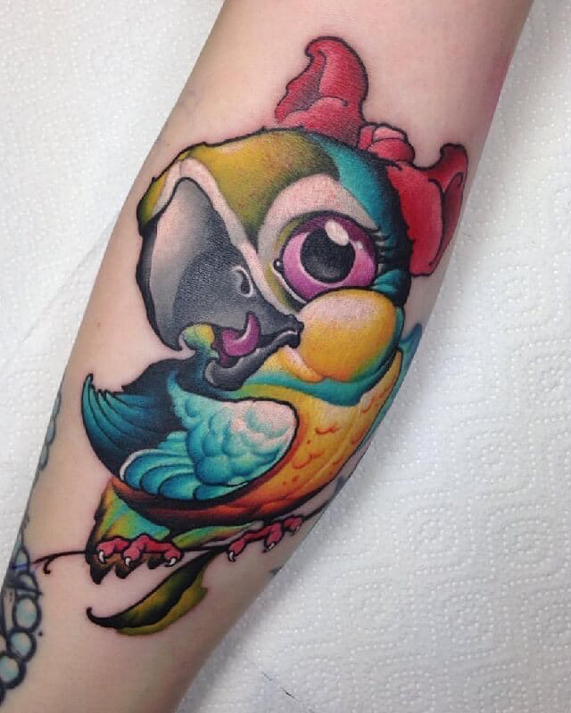 Тату в стиле new school (нью скул) – своеобразный ответ old school, то есть «старой школе». В новых рисунках тоже много ярких красок, но совсем другие сюжеты. Они словно призывают отойти от скучных стереотипов. В new school tattoo много юмора и фантазии, их нередко сравнивают с молодежными граффити.